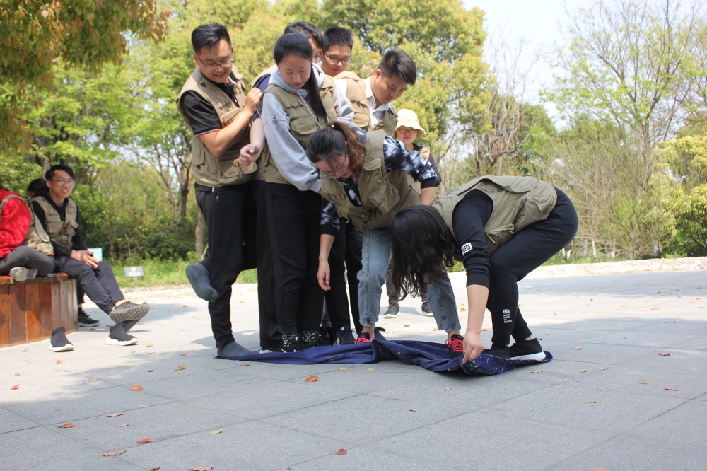 首先是翻葉子,這算是一個(gè)比較經(jīng)典的游戲了,每組隊(duì)員站在一塊布上,然后在所有人不得以身體任意部位碰到布以外的地方,把布翻過來??茨慕M時(shí)間最短。旨在提高大家的協(xié)作能力和團(tuán)隊(duì)精神。最終紅隊(duì)更勝一籌,穩(wěn)中求快就會(huì)勝利。
