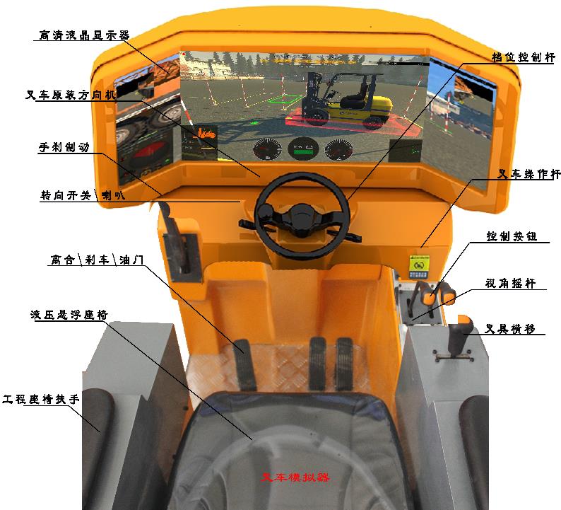 該設(shè)備硬件由懸浮式座椅、駕駛座艙、底座平臺(tái)、PC系統(tǒng),視屏顯示器,方向機(jī),檔位桿,操作桿,IC卡讀寫裝置、360視角調(diào)整搖桿、油門、離合、剎車踏板,轉(zhuǎn)向開關(guān),數(shù)據(jù)采集卡、控制臺(tái)及各種功能控制按鈕組件等組成。設(shè)備采用與真實(shí)叉車相同的操作部件,逼真的操作手感,使得其操作功能、操作感覺與真機(jī)完全吻合;