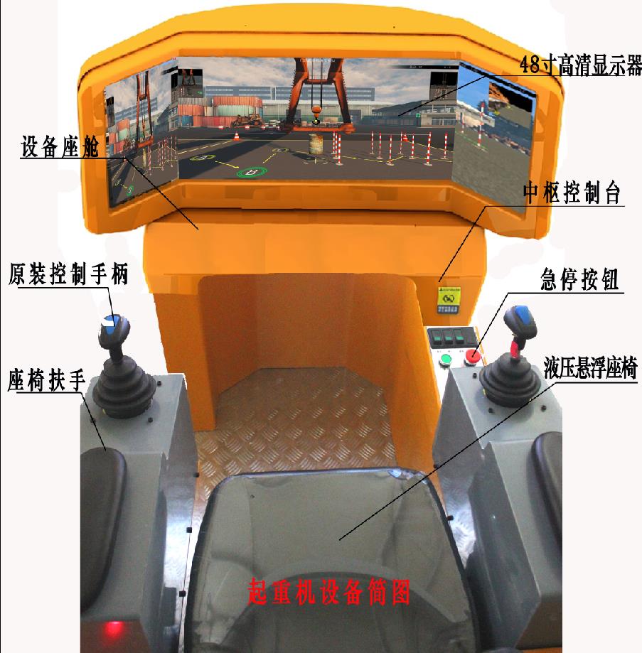 該模擬教學(xué)設(shè)備硬件由懸浮式座椅、駕駛座艙、底座平臺(tái)、PC系統(tǒng),視景顯示器,五級(jí)變速原裝塔吊控制主令,急停按鈕,IC卡讀寫(xiě)裝置、360視角調(diào)整搖桿、數(shù)據(jù)采集卡、控制臺(tái)及各種功能控制按鈕組件等組成。設(shè)備采用與真實(shí)塔吊相同的操作部件,逼真的操作手感,使得其操作功能、操作感覺(jué)與真機(jī)完全吻合;